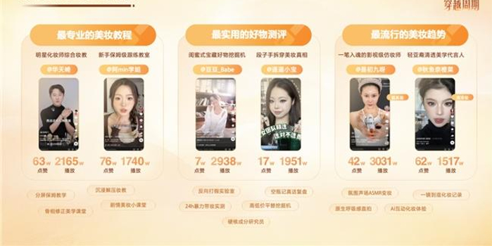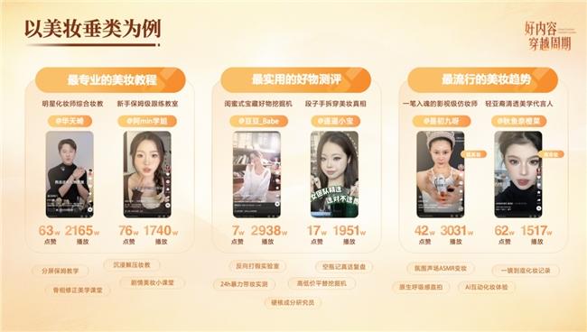 曾桢分享了平台侧的趋势洞察,用户愈发偏好“好看、有用、专业”的内容,比如舞蹈从洗脑卡点走向氛围感表达,美妆从产品测评走向专业教学等等,整体上是从浅层刺激,走向更有质量的内容消费。