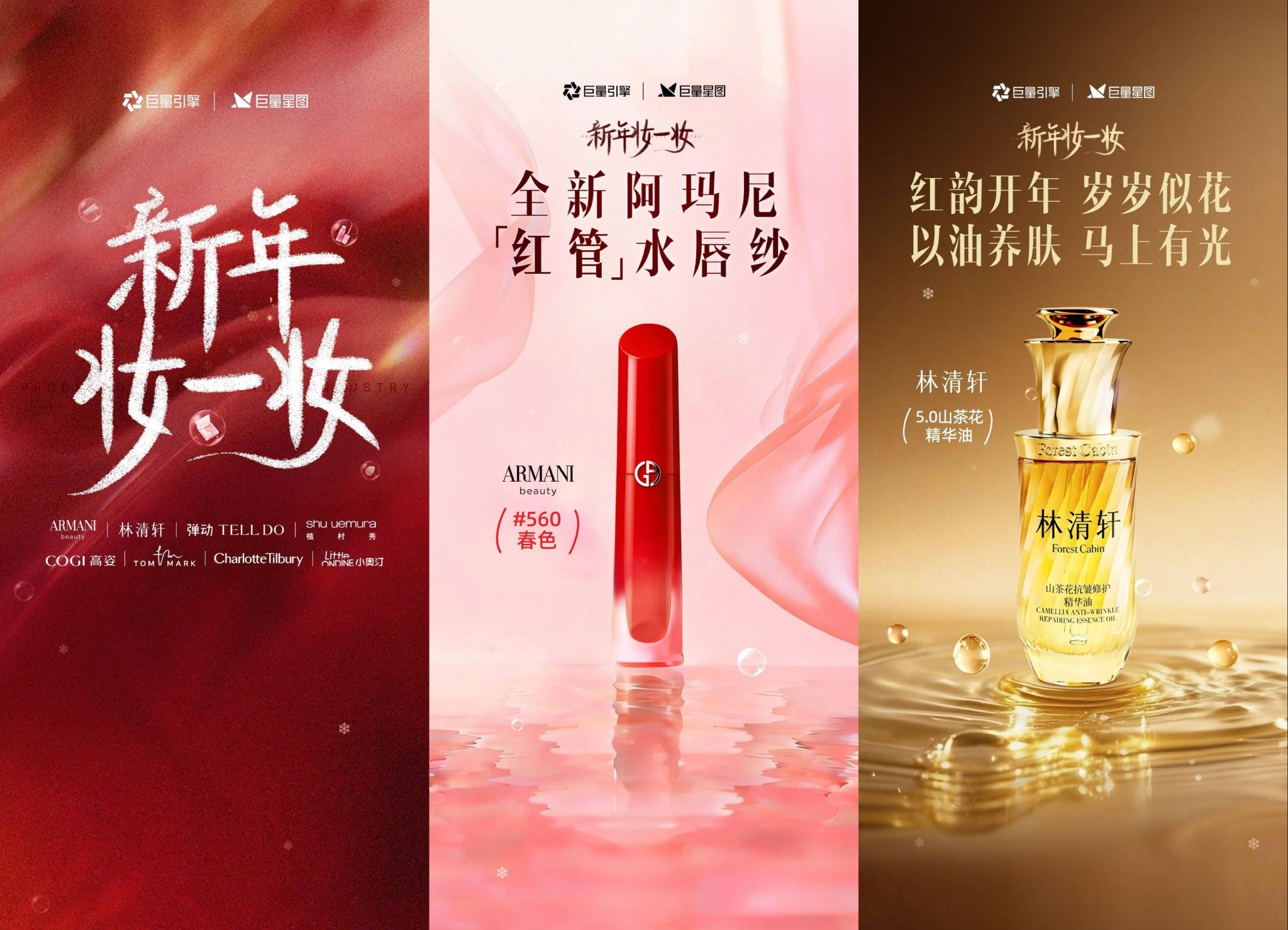活动期间,巨量引擎携手阿玛尼,林清轩,弹动,植村秀,高姿,唐魅可等品牌,从打造定制产品开屏广告,到结合节点的定制内容,不仅呼应了流行的妆容趋势,同时更精准地契合了当下年轻人的情绪共鸣。比如阿玛尼基于新春新色和#2026你好出色 话题,打造品牌定制“春色”唇妆,寓意新的一年面若桃花,生机明媚,将品牌无缝融入节日场景。林清轩也抓住年轻人红运开年的情绪,以“马上有光”将定制产品与年轻人肌肤好状态、新年好运势相联系。