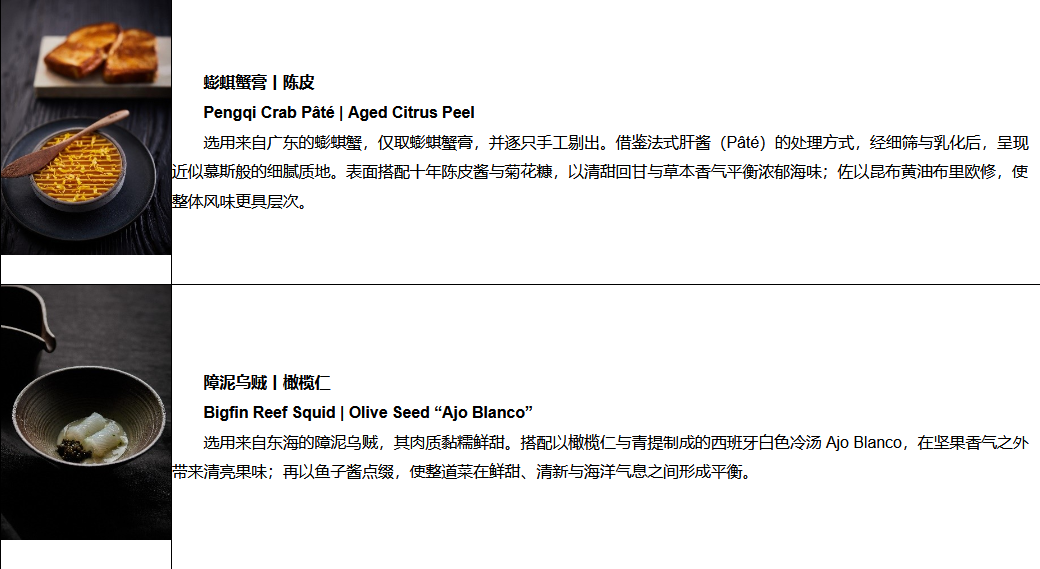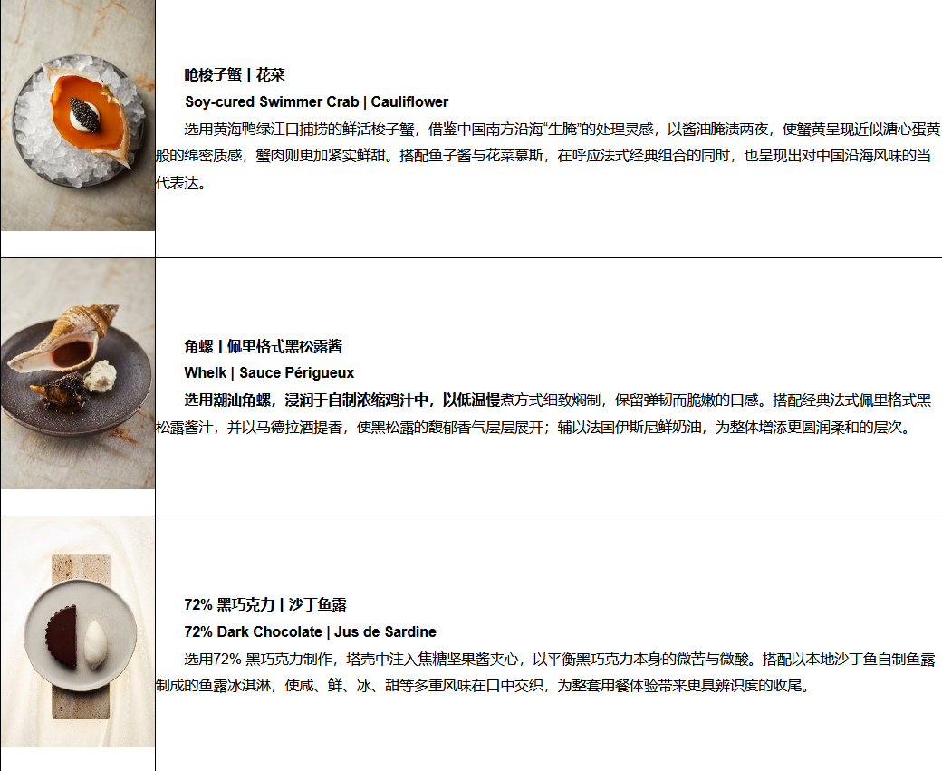 跨地域、多文化的历练,使他逐步形成融合法式技法、明火运用、食材本味与亚洲味觉感知的料理风格。在 La Bourriche 133,他围绕海鲜展开当代表达,让不同海域、不同状态的海鲜呈现出更鲜明而贴切的风味面貌。凭借这一持续深化的料理表达,他先后入选 2023 Tatler Gen.T 新锐先锋 及 2023 福布斯中国·福厨30。