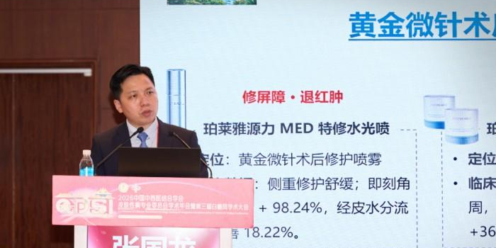 由中山大学附属第三医院赖维教授和中国医学科学院皮肤病医院杨雪源教授主持的专题会上,上海市皮肤病医院张国龙教授围绕《面部衰老黄金微针术后修复策略的探索与价值》进行分享,结合临床观察与量化测试结果,系统介绍了黄金微针术后在退红舒缓、屏障修护及防晒、防反黑等方面的修护思路。其中,珀莱雅源力MED特修水光喷、源力MED特修水光次抛、轻享阳光舒护物理防晒霜等产品,围绕术后场景开展了针对性验证,为皮肤术后护理提供了更具实证基础的解决路径。相关研究显示,上述产品在角质层含水量、经皮水分流失、红斑指数、血红素含量等指标上,均取得了较为清晰的量化结果。