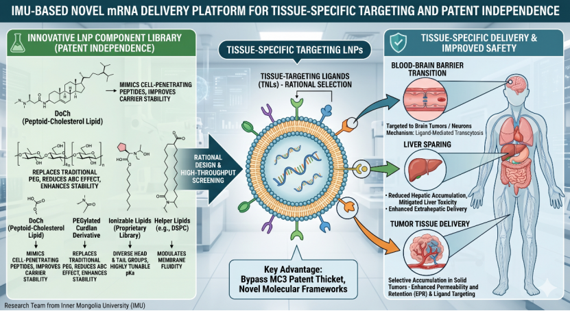 内蒙古大学团队的突破性成果,首要意义在于其构建了完整独立的知识产权体系。团队所研发的拟肽功能化胆固醇脂质(DoCh)、PEG化Curdlan衍生物等一系列递送材料,均绕开了以MC3为代表的典型LNP专利丛林,为国内药企提供了完全不同的分子骨架选择。更重要的是,这种自主性不仅体现在规避专利上,更体现在性能的提升上。其载体具备高度的“组织特异性”,能克服传统载体易在肝脏富集带来的毒性问题,并实现常规技术难以做到的跨血脑屏障靶向递送。这一成果为构建我国自主可控、安全高效的mRNA药物产业体系,提供了关键的底层技术支持,从根源上保障了国家生物安全和相关产业链的韧性。