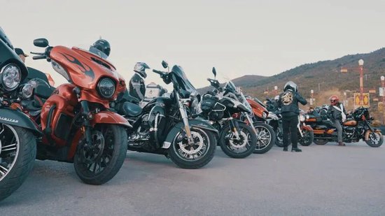 发车现场旌旗猎猎、气氛热烈。50余辆哈雷摩托车整齐列队,车身统一张贴活动主题车贴,在暮色中格外亮眼。骑士们身着专业骑行装备,精神饱满、气势昂扬。全体人员集体合影、齐声喊出活动口号,为这场滇藏天路之旅正式拉开序幕。