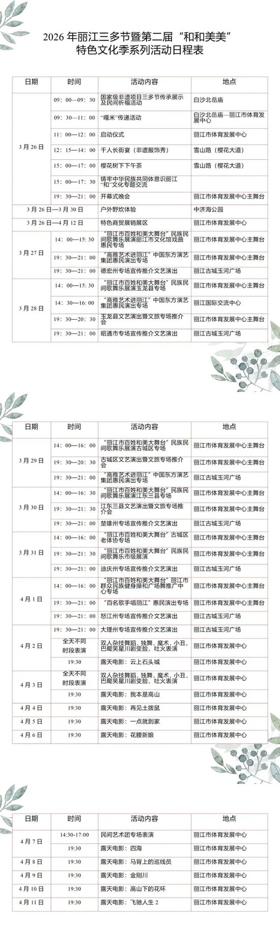 关注3月26日,2026年丽江三多节暨第二届“和和美美”特色文化季系列活动启动仪式,在丽江市体育发展中心举行。这场融合非遗民俗、民族文化、春日美景与文旅消费的盛宴,从当日起持续至4月12日,以丽江市体育发展中心为主会场,在丽江古城、白沙、雪山路、中济海等地同步设立分会场,全方位展现丽江多民族融合发展的独特魅力,为八方游客带来沉浸式文旅新体验。